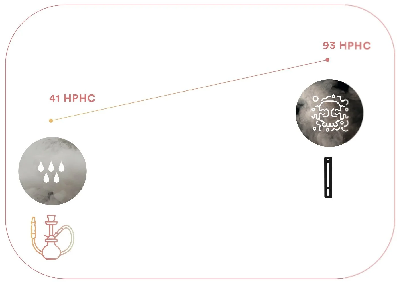 Cigarette smoke is a mixture of thousands of chemicals produced by the burning of tobacco, paper, inks, and adhesives at temperatures as high as 900 O C. In contrast, shisha cloud is produced by heating at significantly lower temperatures, which has been shown by the development of Heat not Burn (HnB) cigarette-like products to eliminate or significantly reduce the number and concentration of chemicals associated with burning. 5 , 6